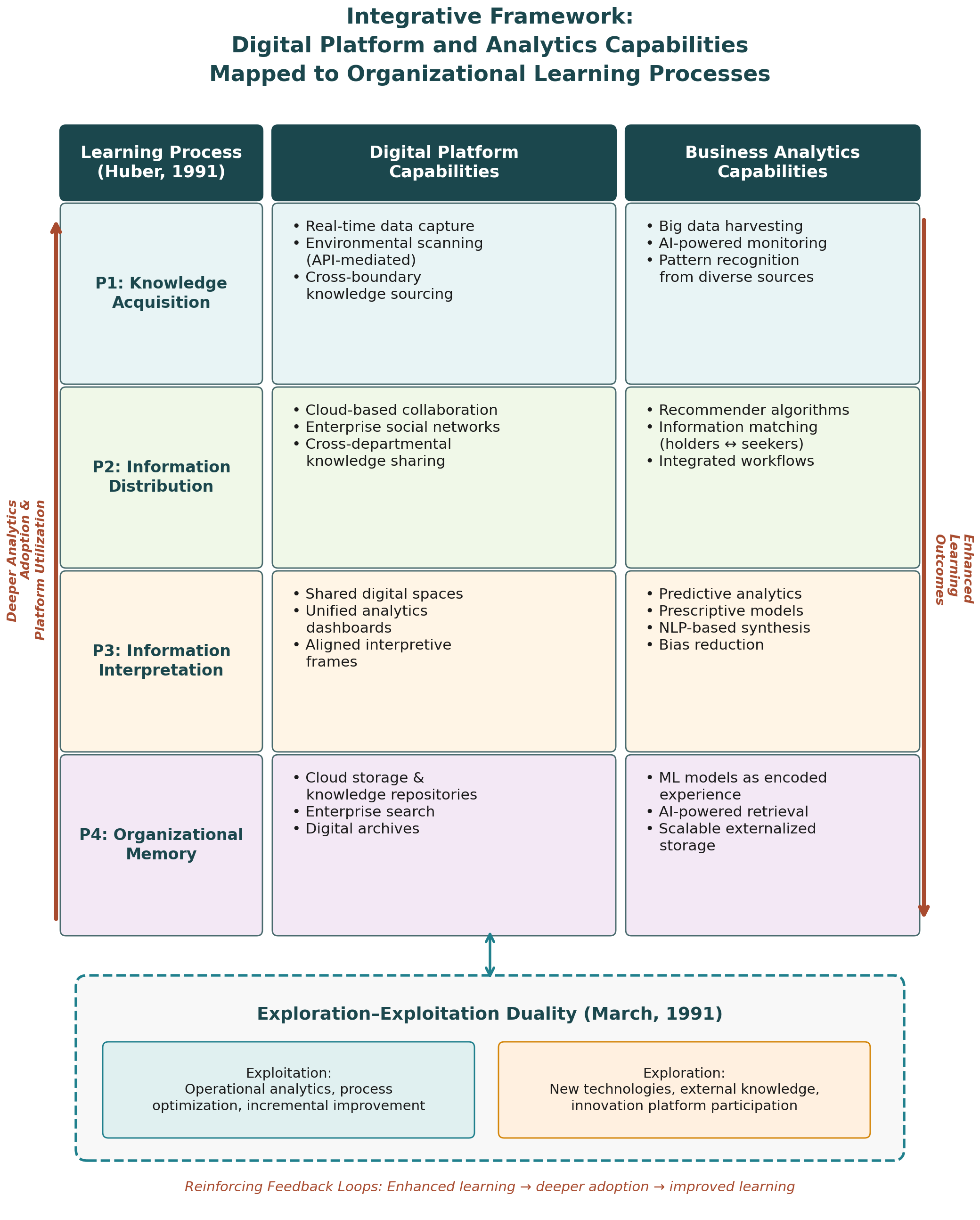 Digital platforms and business analytics are fundamentally reshaping how organizations acquire, distribute, interpret, and retain knowledge; however, few studies have systematically examined how digital platform capabilities map onto specific dimensions of organizational learning. This paper addresses this gap through a conceptual literature synthesis that integrates scholarship on digital platforms, business analytics, and organizational learning theory. Drawing on Huber's four-process model of organizational learning—knowledge acquisition, information distribution, information interpretation, and organizational memory—as well as March's exploration–exploitation framework, this study develops an integrative conceptual framework comprising four propositions linking digital platform and analytics capabilities to each learning dimension. The framework identifies reinforcing feedback loops through which enhanced learning drives deeper analytics adoption and digital platform utilization. Theoretical implications for updating organizational learning theory in the digital age are discussed, alongside practical implications for financial institutions pursuing digital transformation. Future research directions include empirical validation through firm-level surveys, industry-specific case studies, and longitudinal investigations of digital learning evolution.